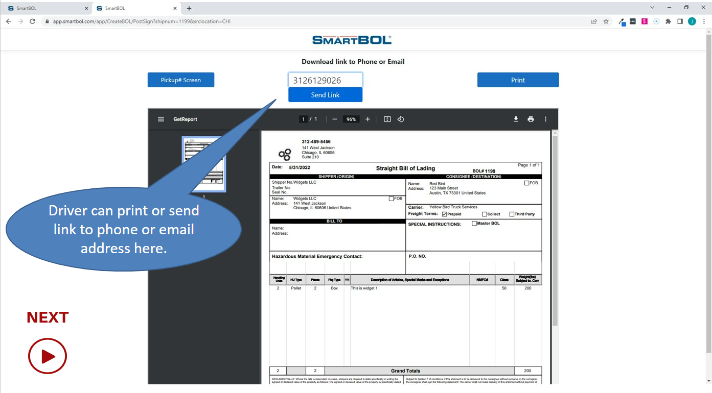 Send link to the BOL to a phone or through email to access the BOL on other devices